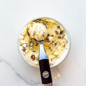In this recipe, I use is my go-to vanilla bean ice cream base. Dark chocolate ice cream would also make a great base for this recipe.