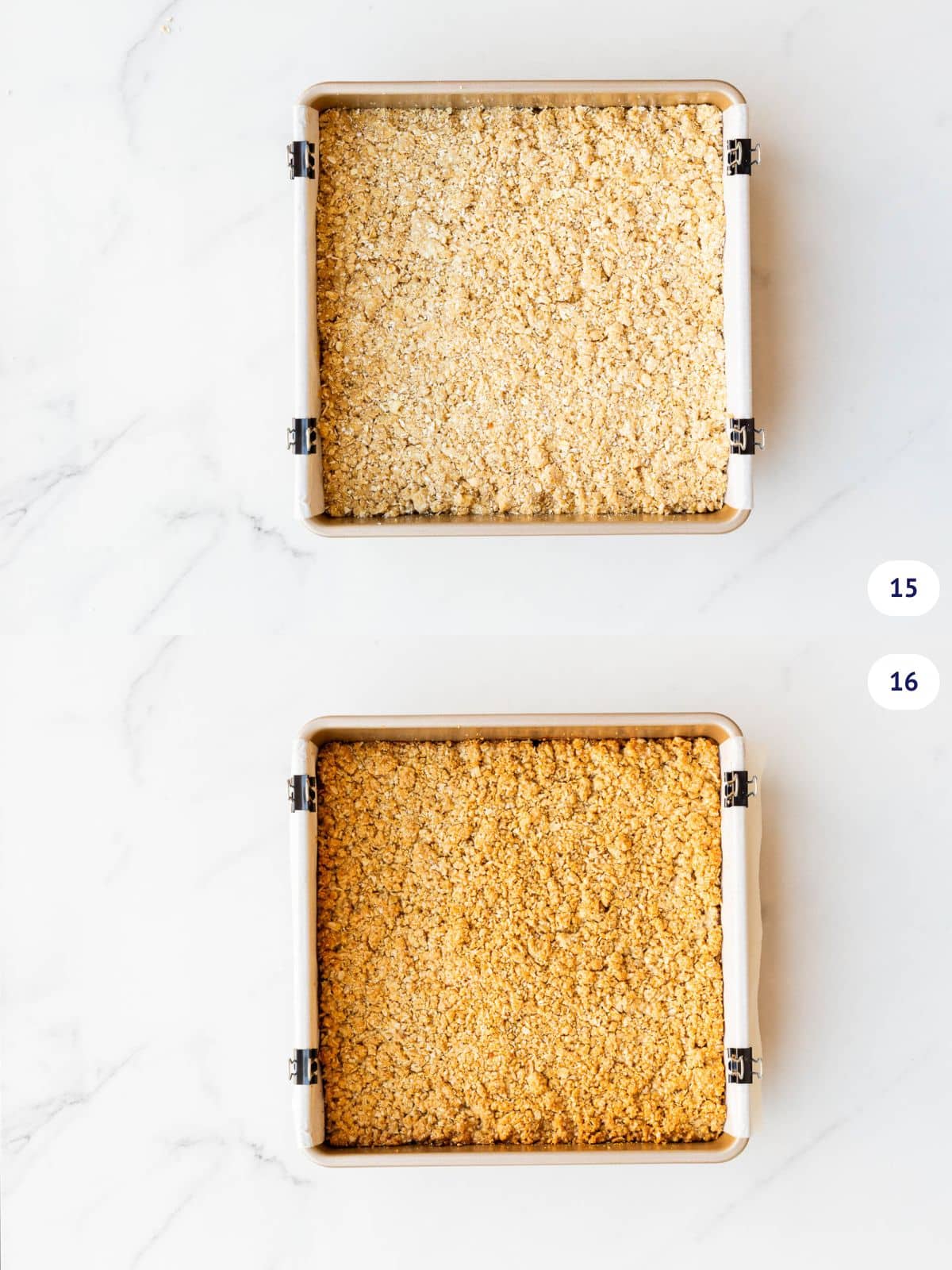 Step 7: Gently press the topping into the apple filling very lightly to anchor the topping in place (image 15). Bake until golden brown and set (image 16). Let the bars cool completely before slicing.