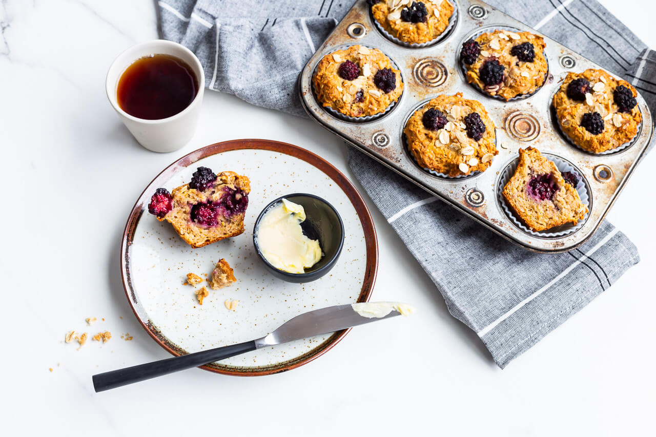 These apple blackberry muffins are quite low in sugar. I'd say they definitely fall into the "healthier" muffin category, along with these blueberry bran muffins, which are also low in sugar. They are the perfect hearty breakfast muffins, made with oats, yogurt, grated apple, and blackberries.
