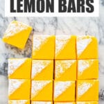 This foolproof recipe for easy lemon bars is made with a shortbread base and topped with tart lemon curd. These lemon squares are bright yellow and very lemony!