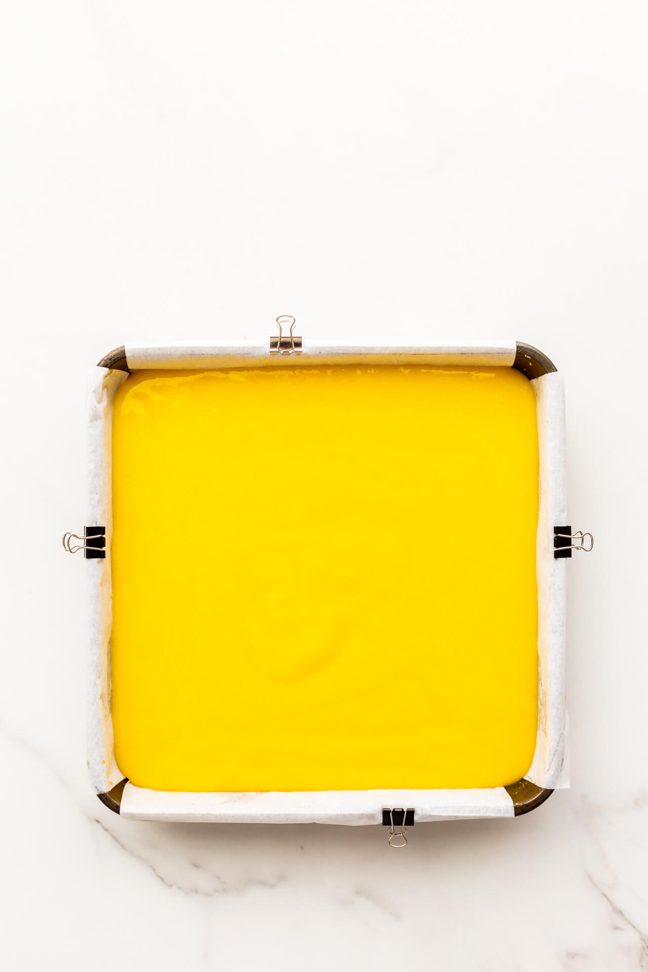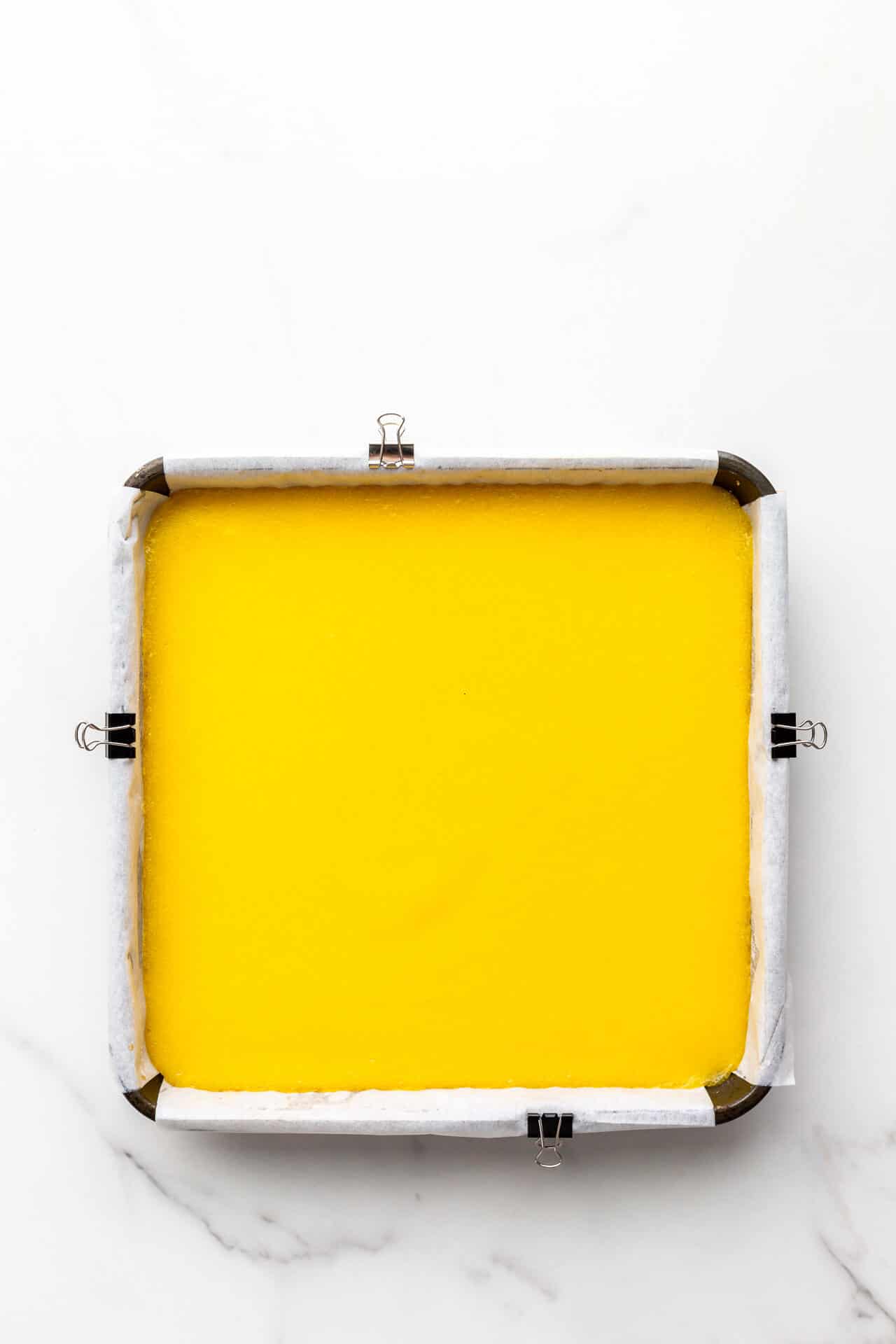 - Pour the curd over the hot crust and smooth the surface with an offset spatula if needed. Make sure the curd covers the entire surface, from one edge of the pan to the other.