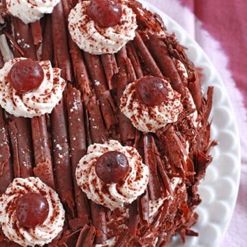 - Top the cake with more chocolate shavings and pipe on a few decorative rosettes with a star tip. Place a cherry in the middle of each rosette.