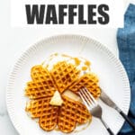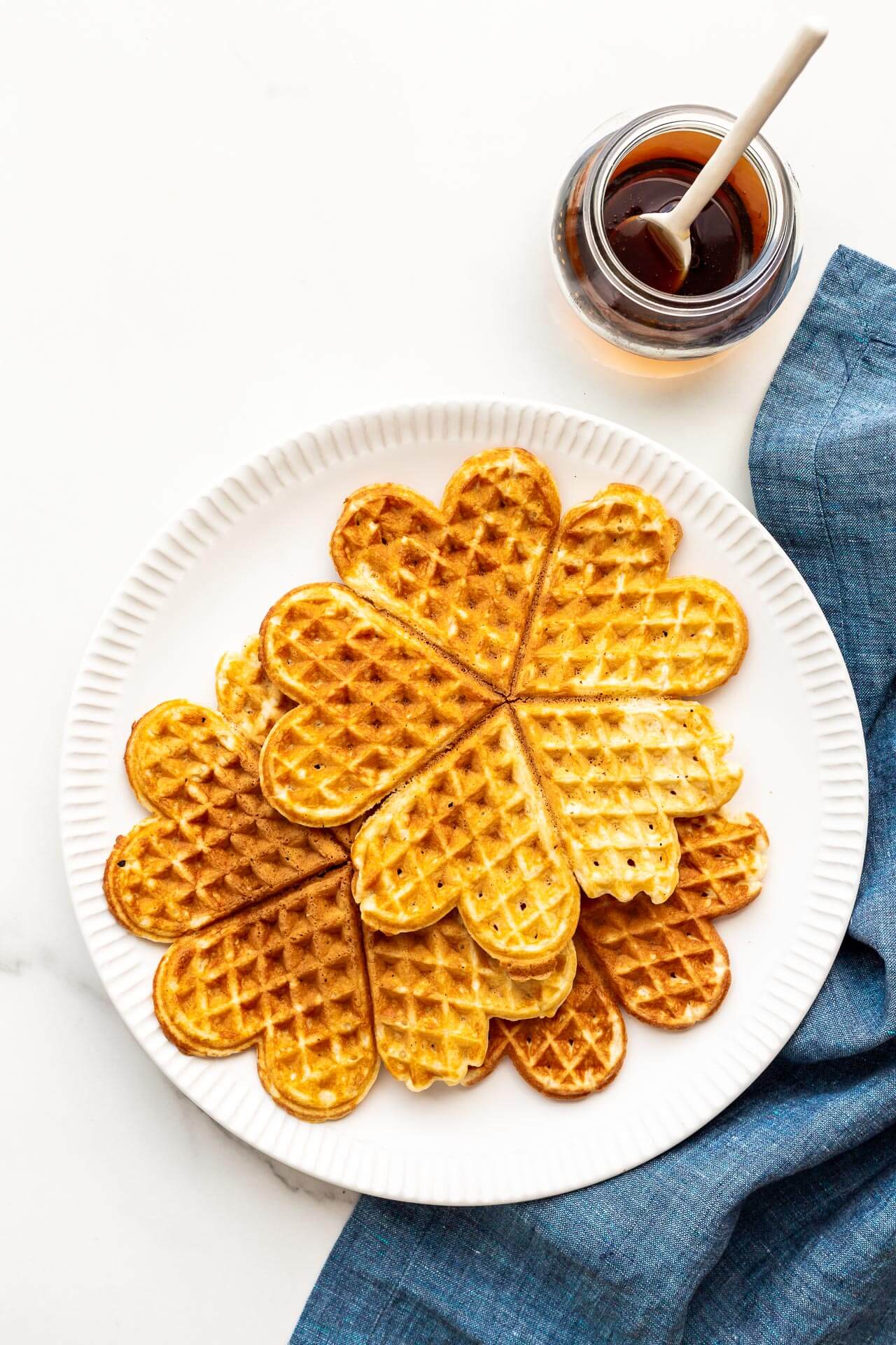If you just want to throw together some batter and make a batch of plain waffles, this is the recipe for you because it's very easy. Feel free to jazz it up by dropping some berries over the batter before closing the lid! I've added cranberries to this recipe to make cranberry waffles to serve with eggnog crème anglaise over the holidays. These cheese waffles have shredded cheddar mixed into the batter.