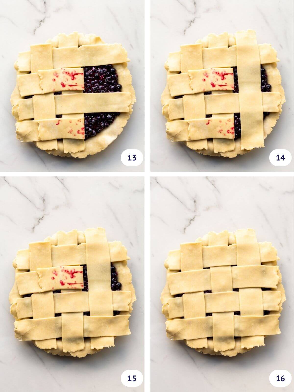 - Step 13–16: Repeat this weaving pattern with the remaining 4 strips of dough. Remember that for each additional strip, you need to alternate which dough strips of the lattice are folded and unfolded as described